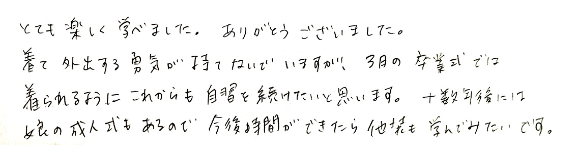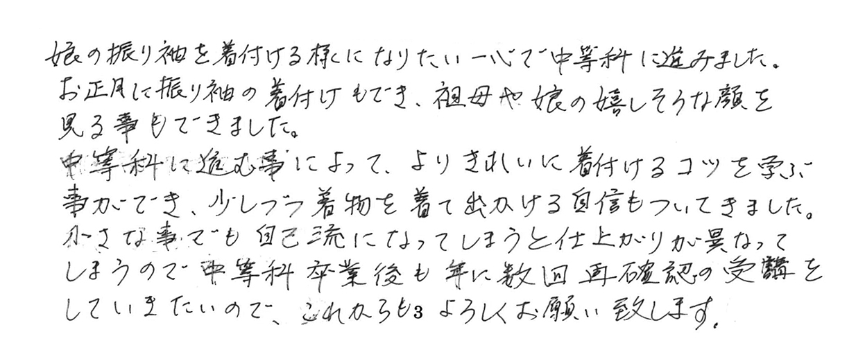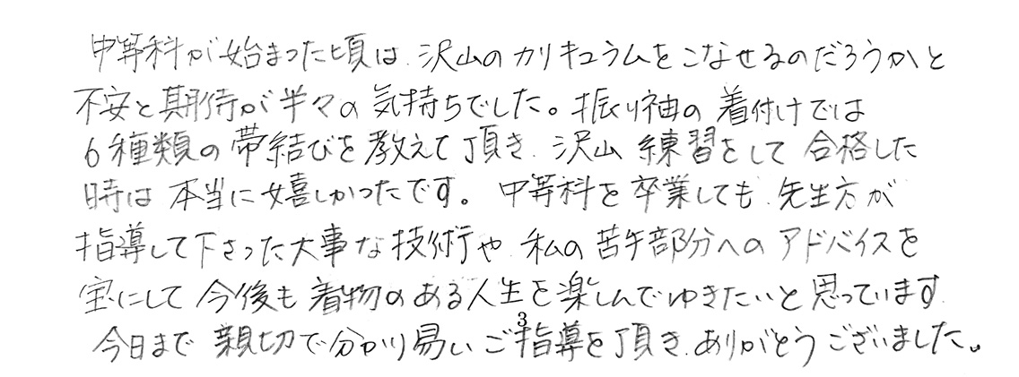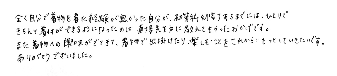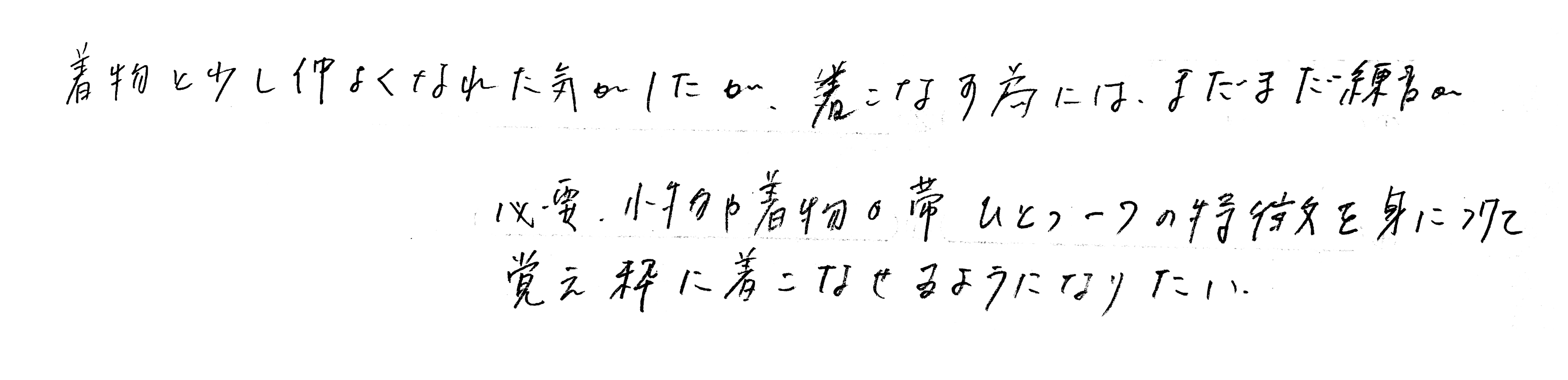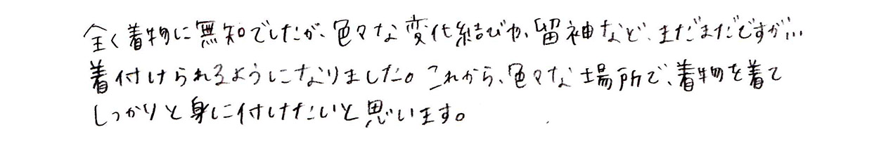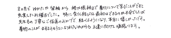 「8か月でゆかたや留袖、袴まで着付について学ぶことができて、充実したお稽古でした。着物がますます好きになりました」