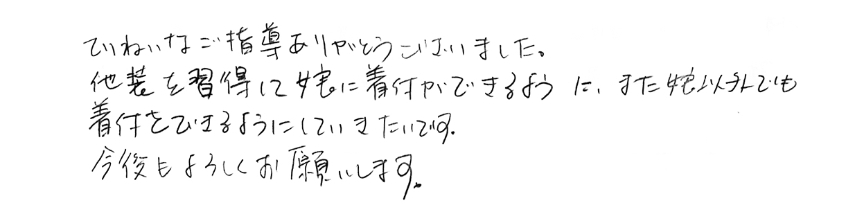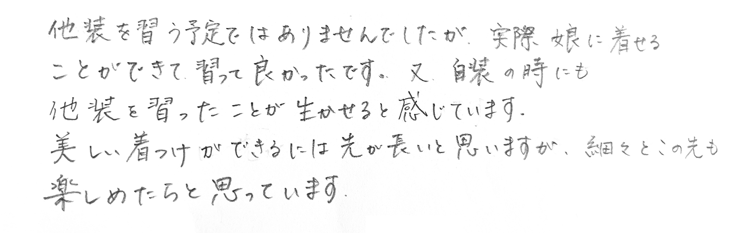 「他装を習う予定ではありませんでしたが、実際に娘に着せることができてよかったです。自装の時も他装で習ったことが生かせると感じています。」