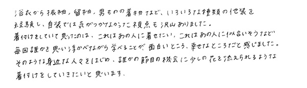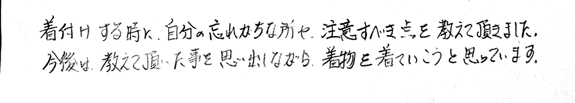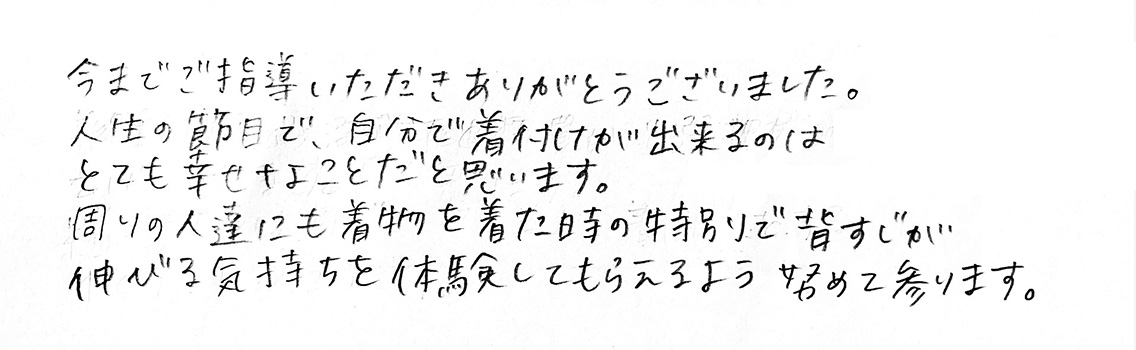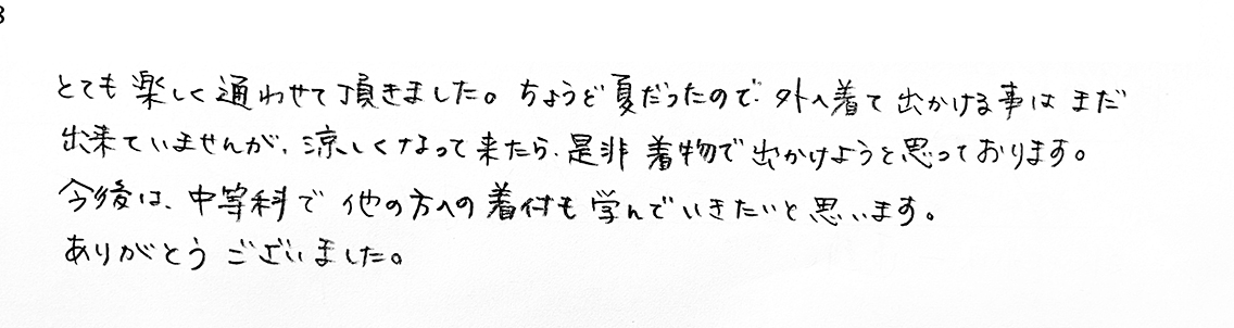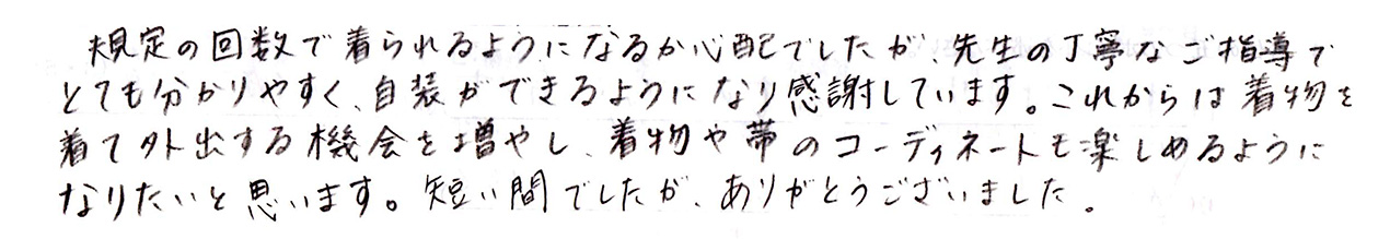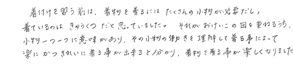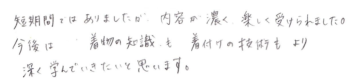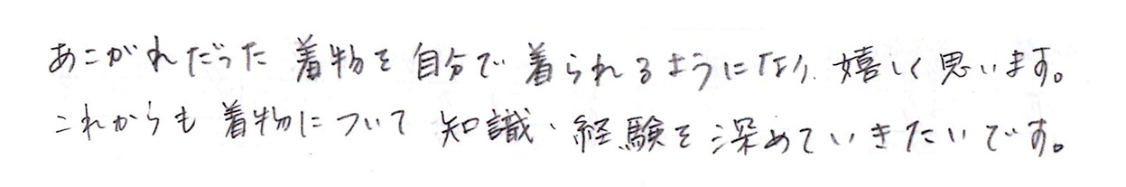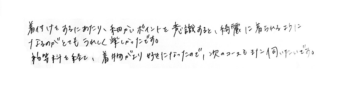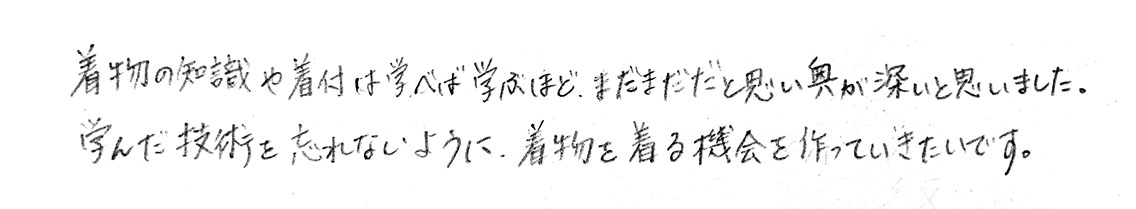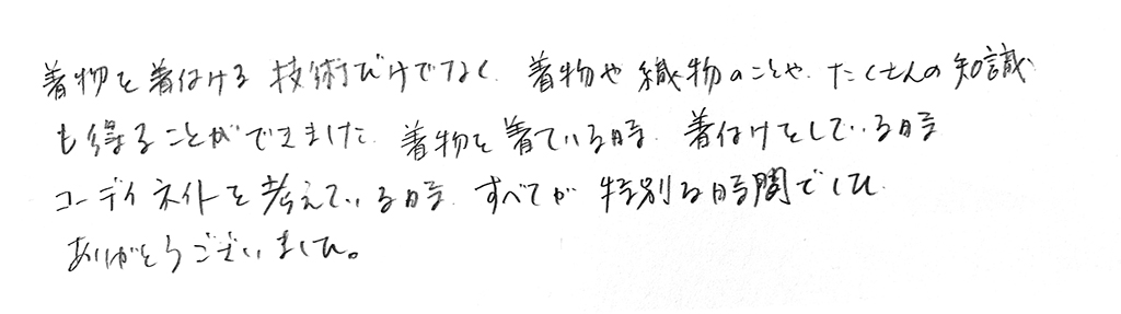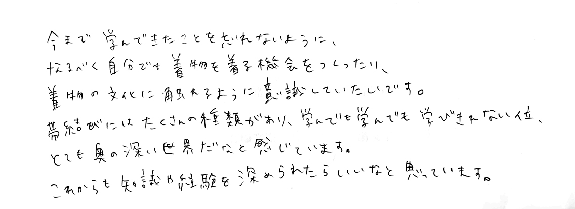 「着付け技術だけでなくたくさんの知識を得ることができました。着物を着るとき、着付けるとき、すべてが特別な時間でした。」