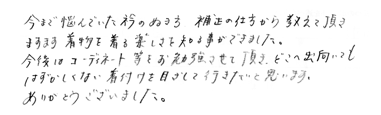 今では着物ででかけるのが楽しみになりました。それが何よりうれしいです。ありがとうございました。