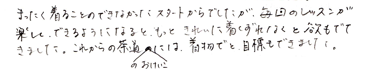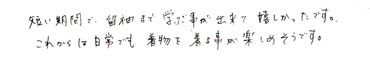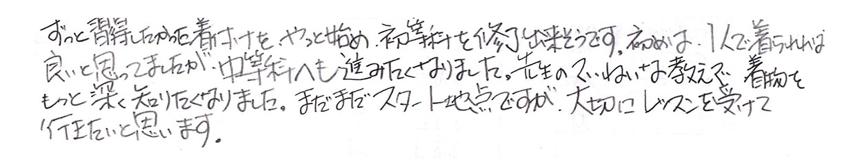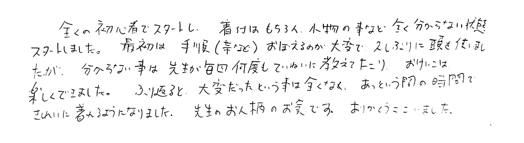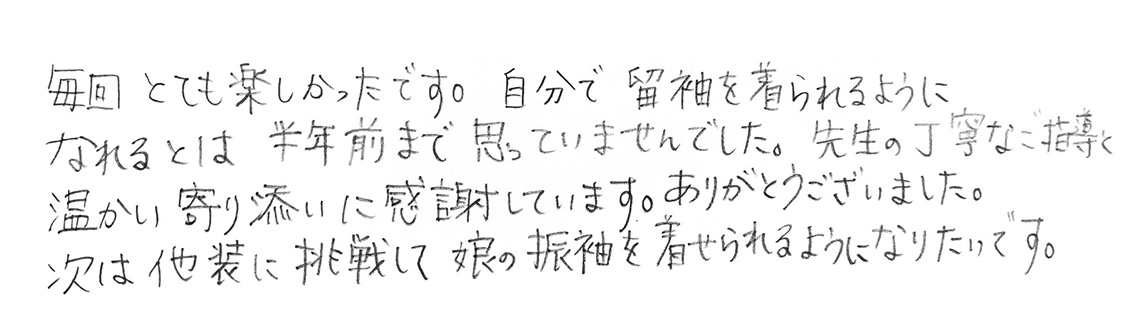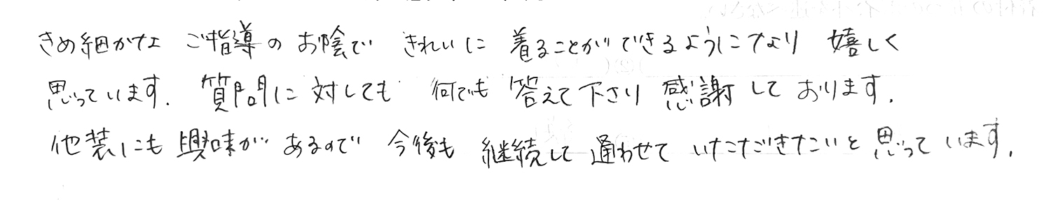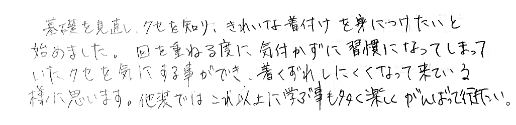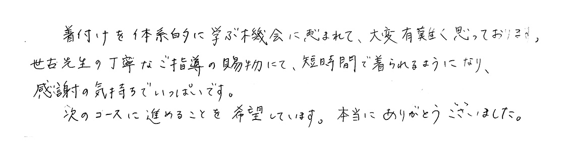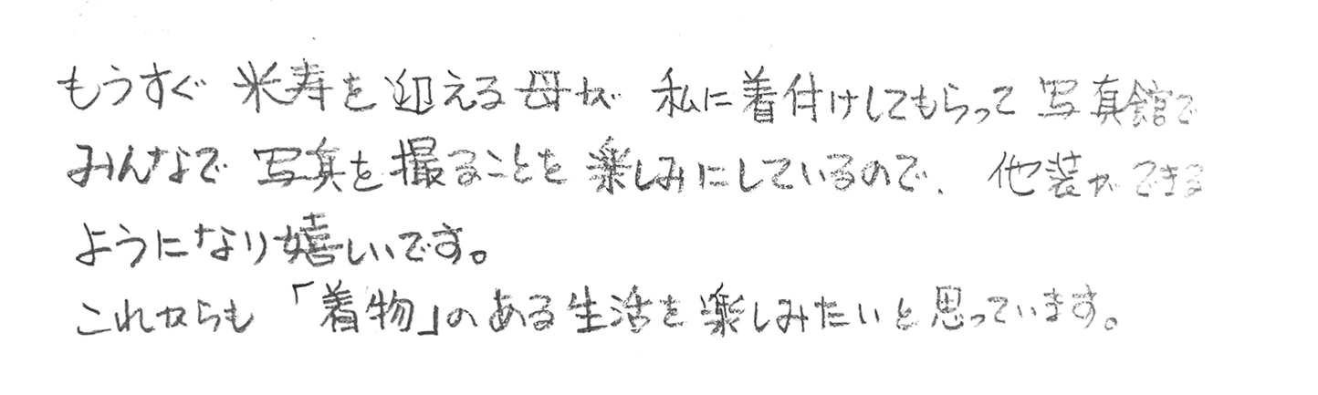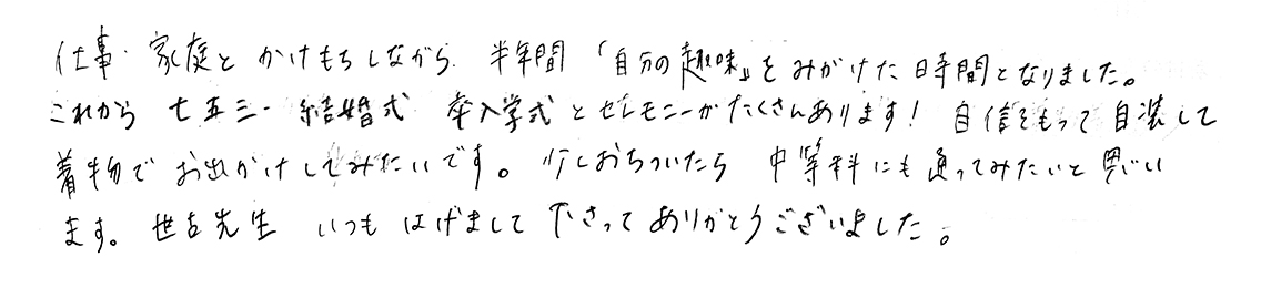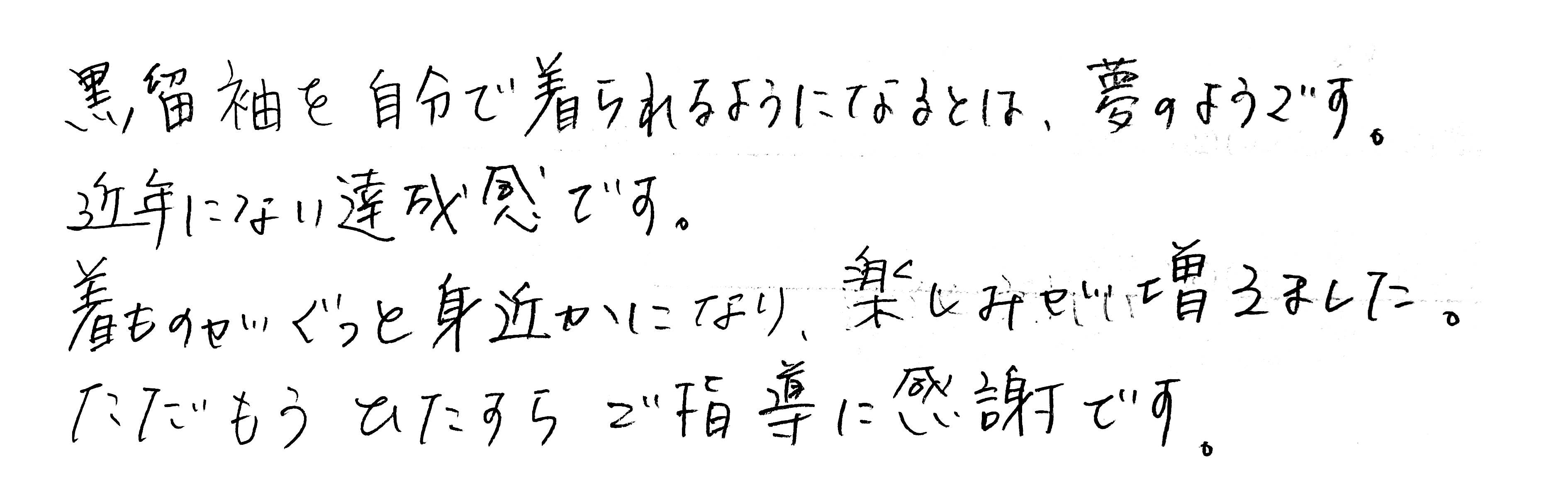 「毎回楽しく通えることができました。来年は息子の結婚式があるので自分で留袖を着てみたいと思います。」