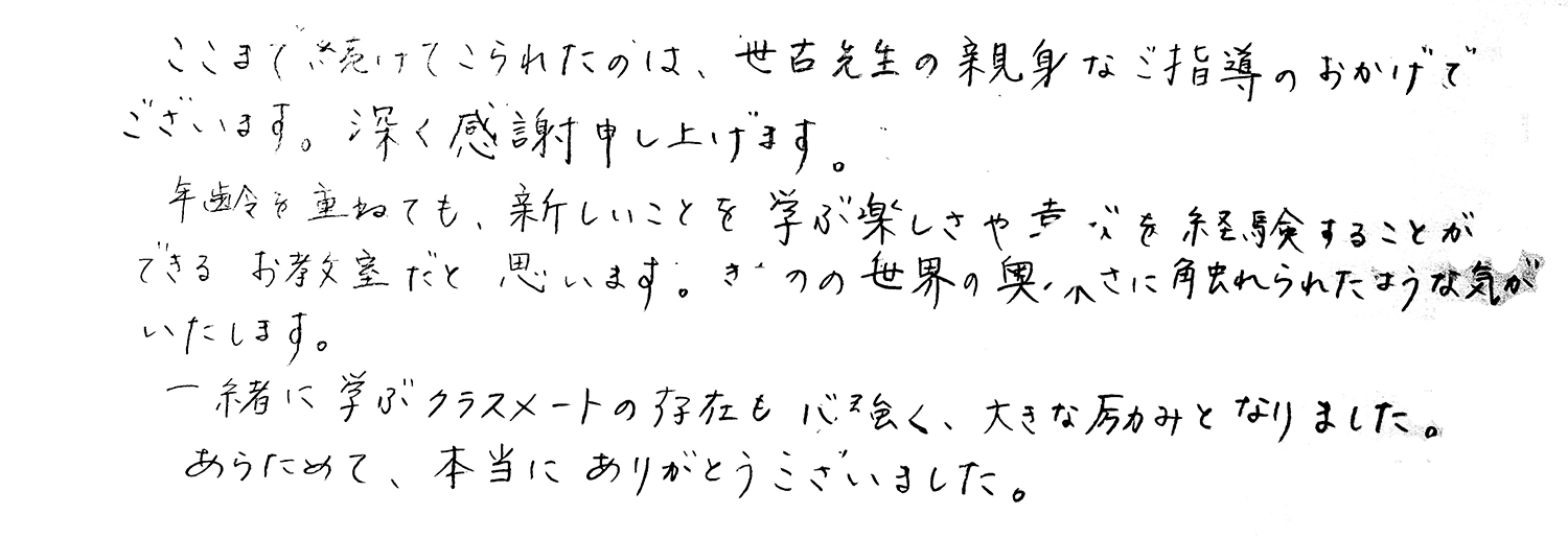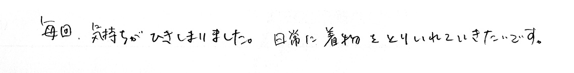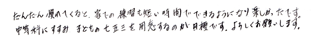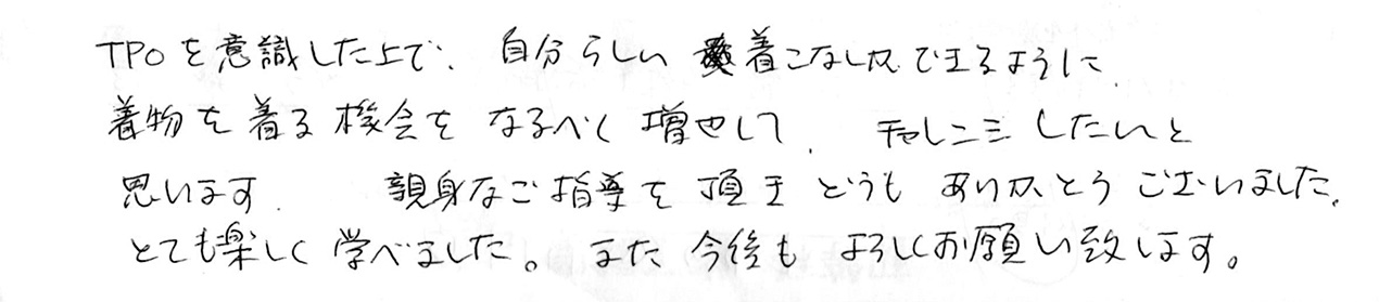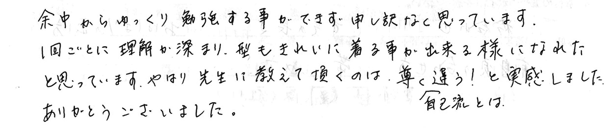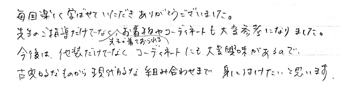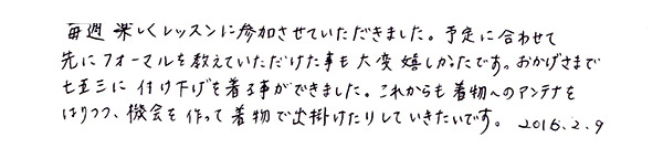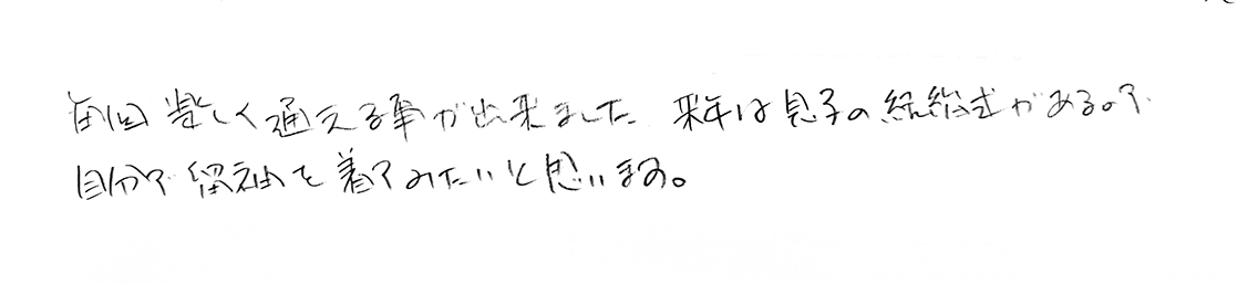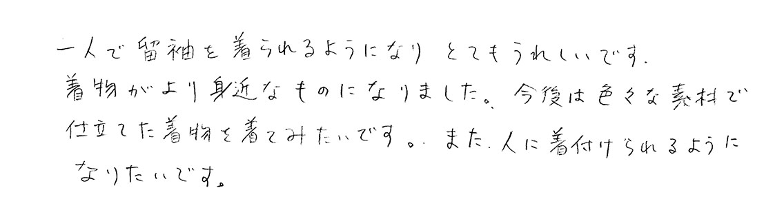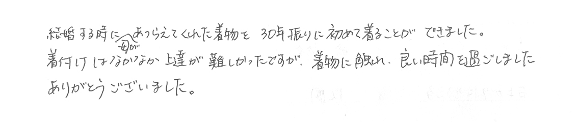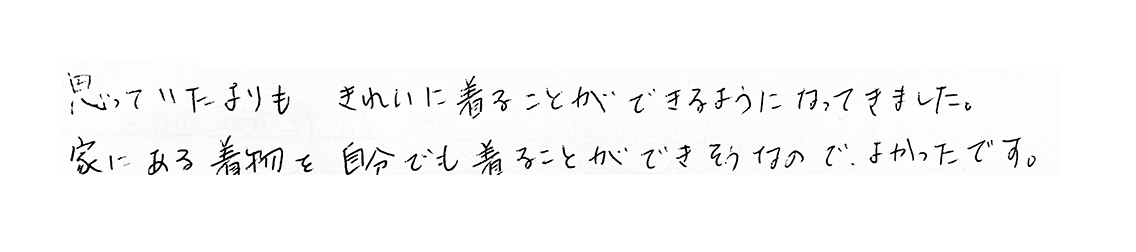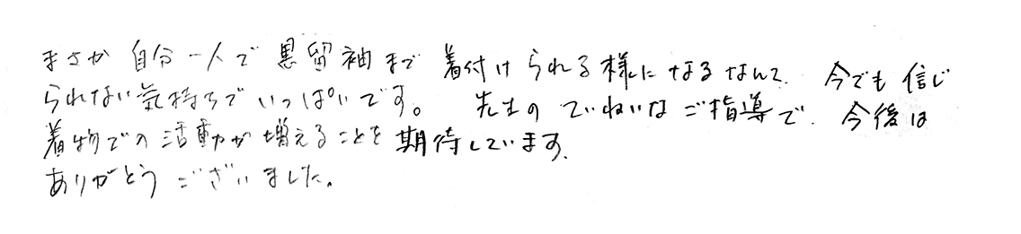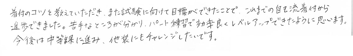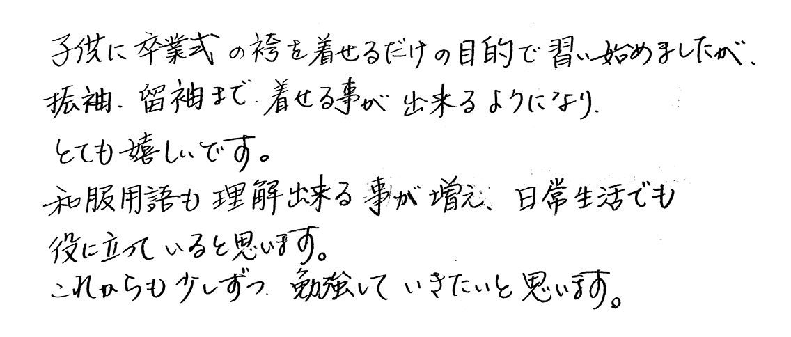 「毎回楽しく通えることができました。来年は息子の結婚式があるので自分で留袖を着てみたいと思います。」