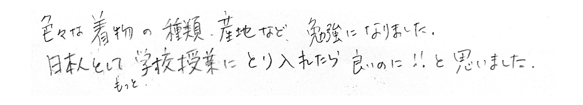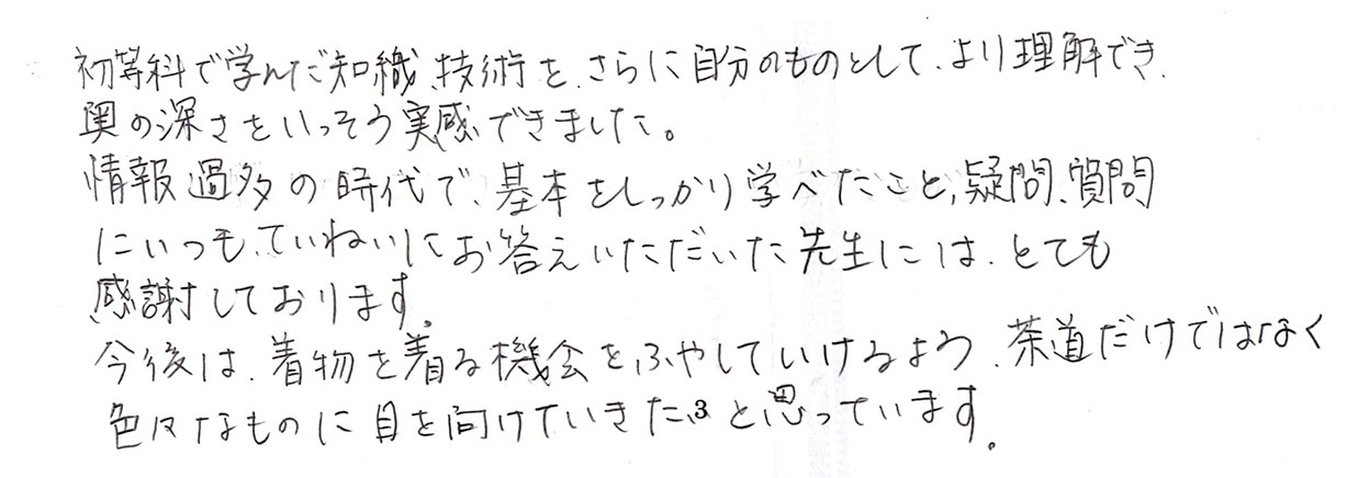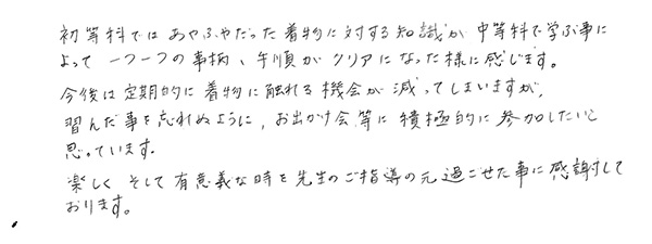 「あやふやだった着物に対する知識が、中等科は一つ一つクリアになったように感じます。楽しく有意義な時を過ごせたことに感謝しております。」