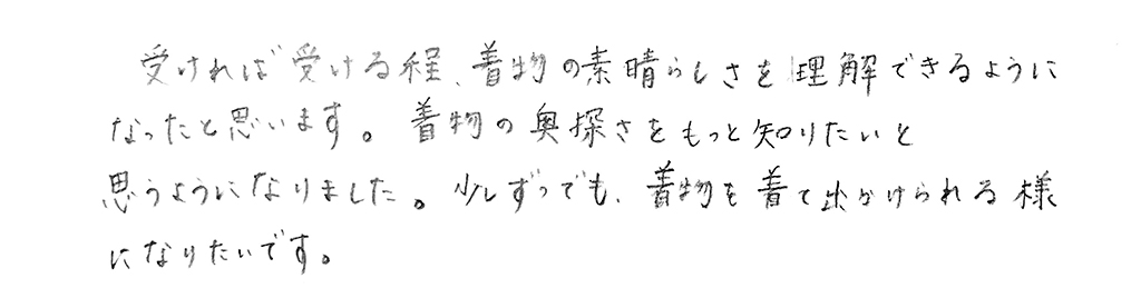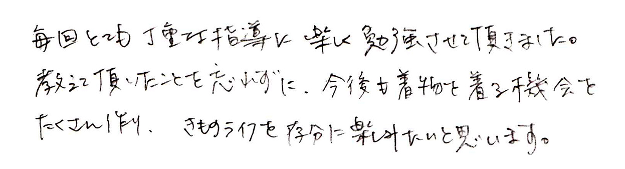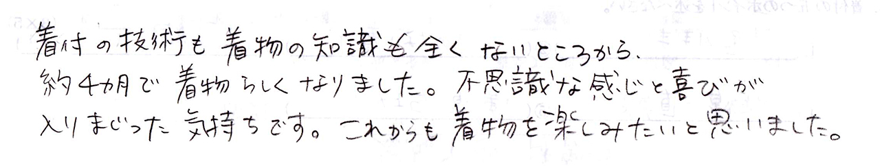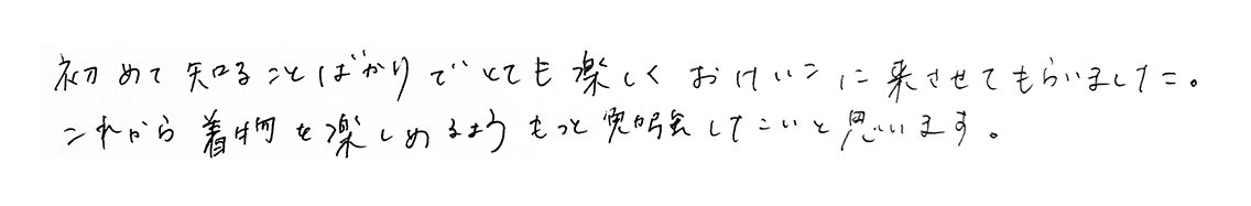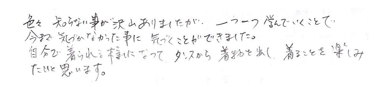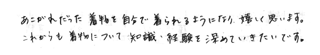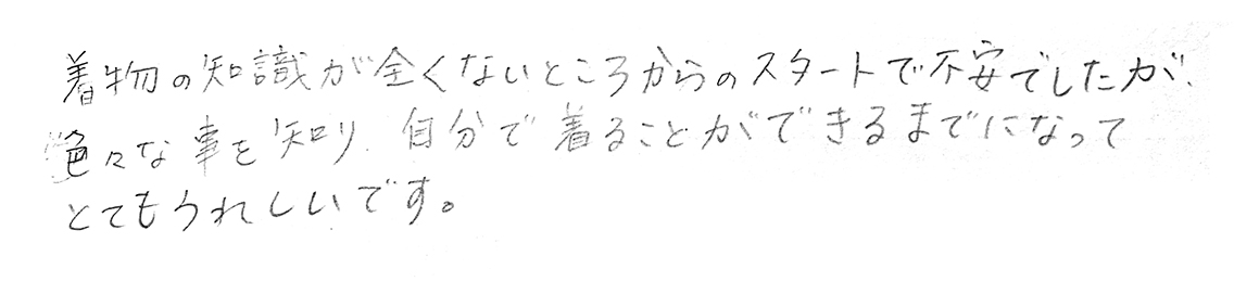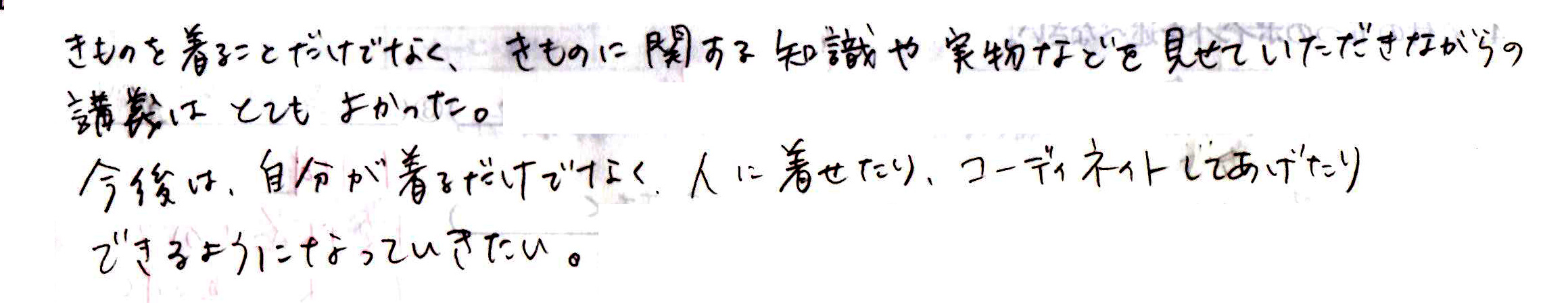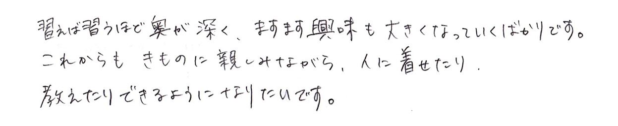 「はじめてのことを学ぶ楽しみが毎週ありました。今後機会をみつけて、着物を着る回数を増やしたいと思います。」
