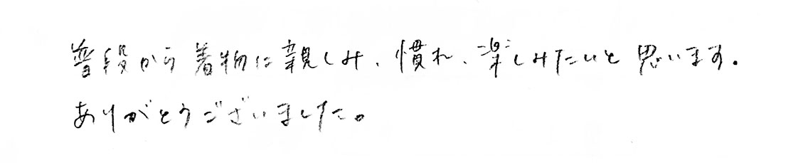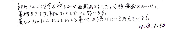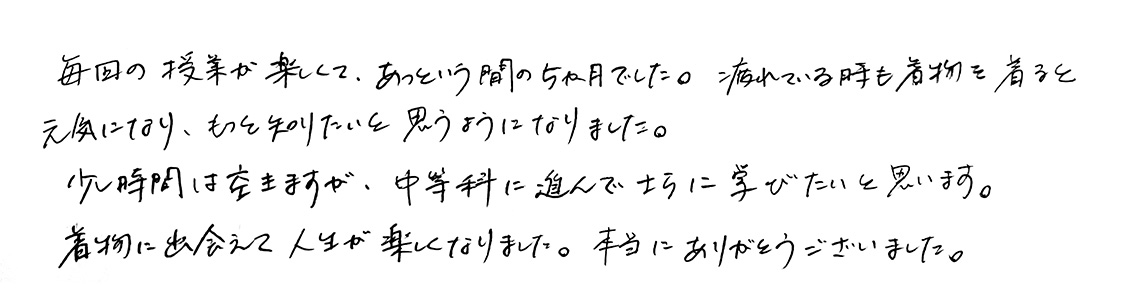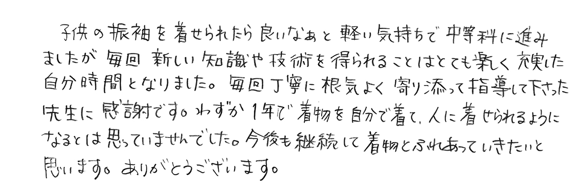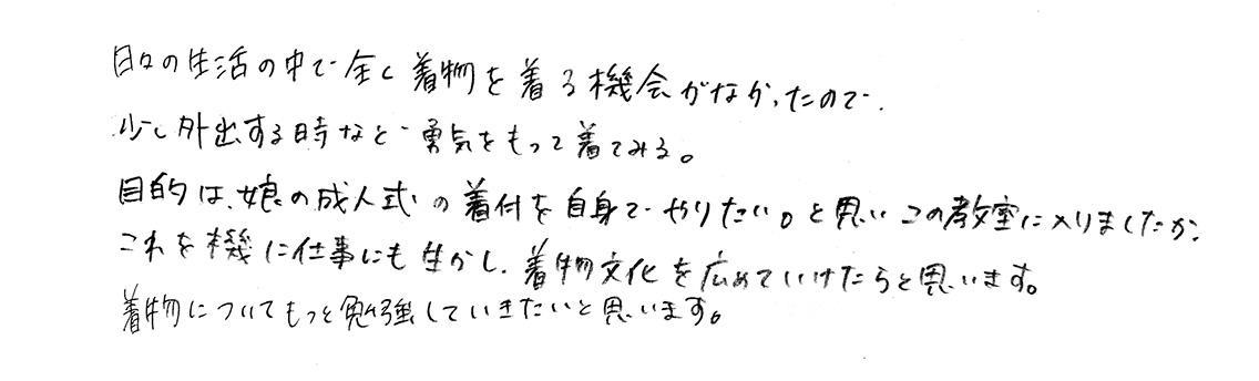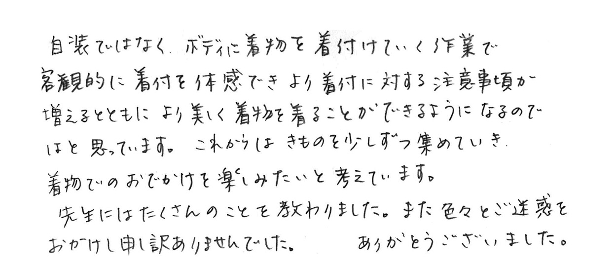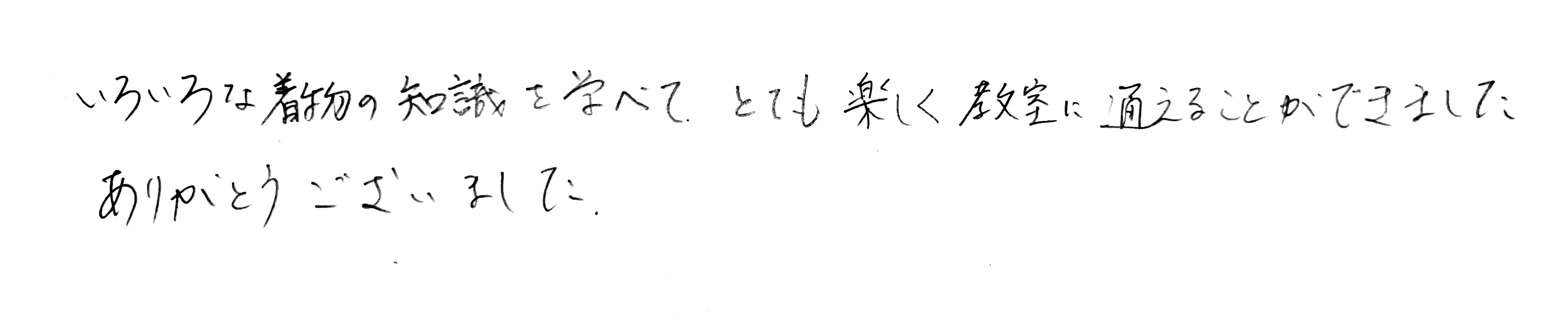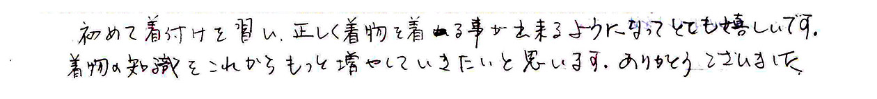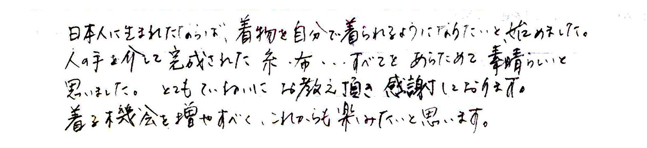 「はじめてのことを学ぶ楽しみが毎週ありました。今後機会をみつけて、着物を着る回数を増やしたいと思います。」