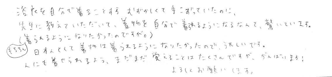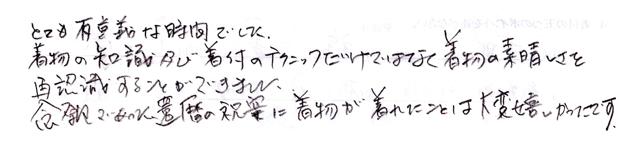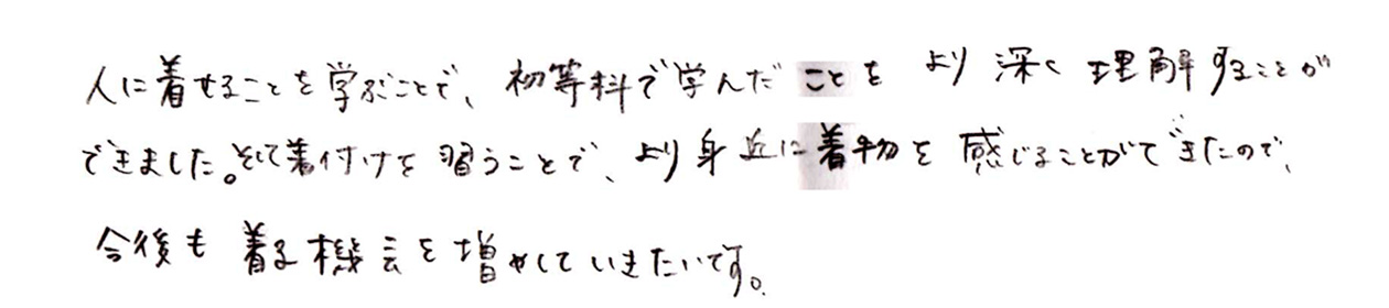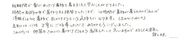「着物を着る技術と楽しさを学ぶことができ感謝しています」