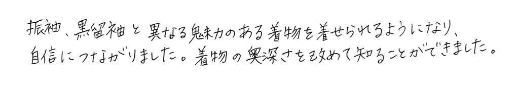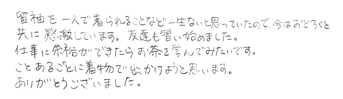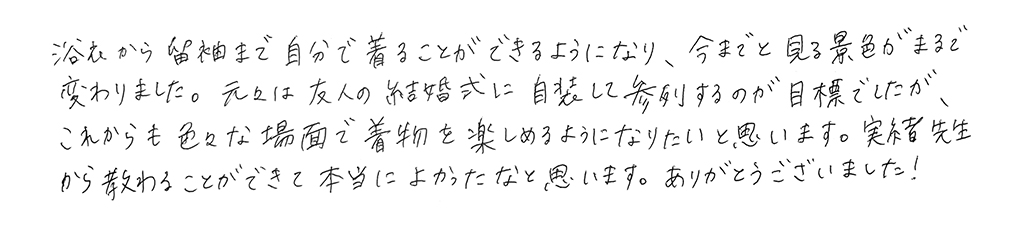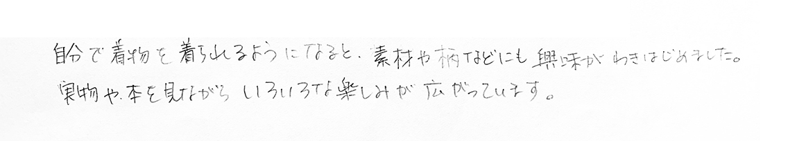 「楽しく充実した自分時間となりました。わずか一年で着物を自分で着て、人にも着せられるようになるなんて思っていませんでした。」