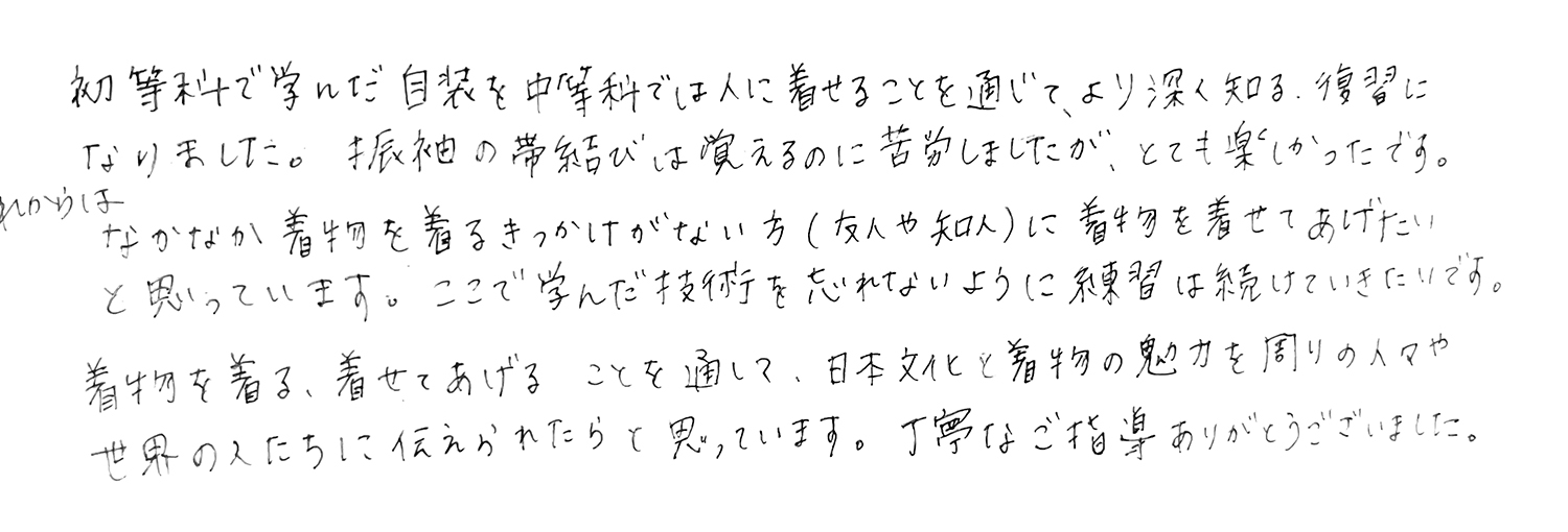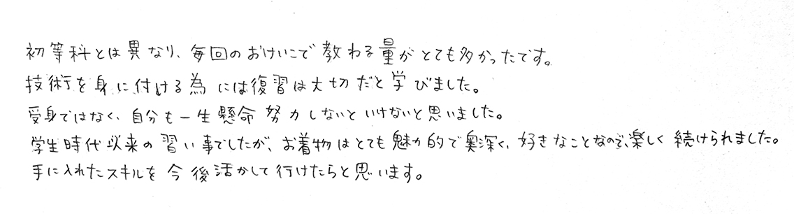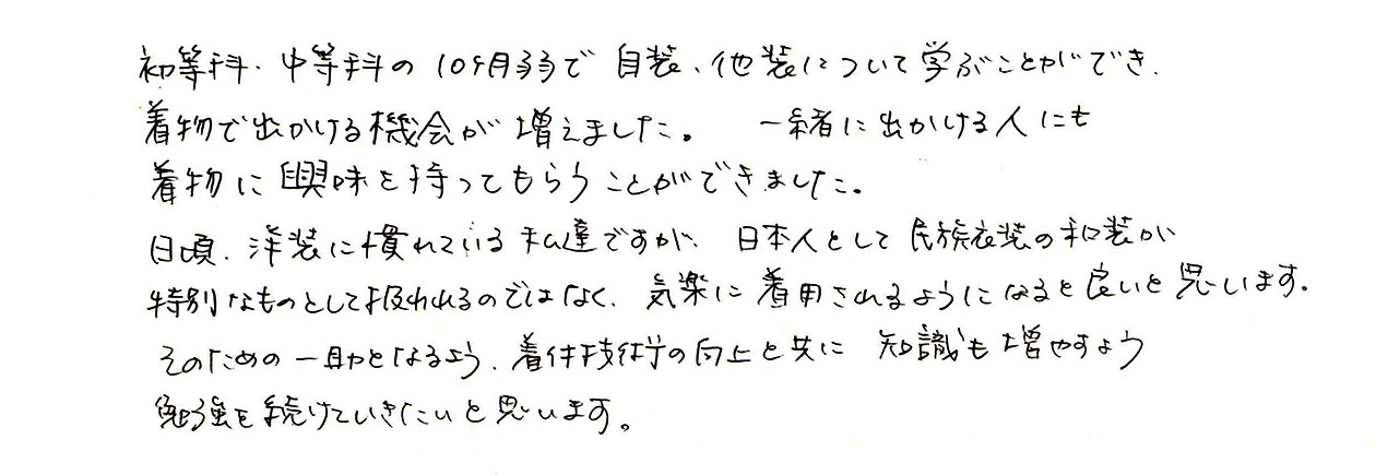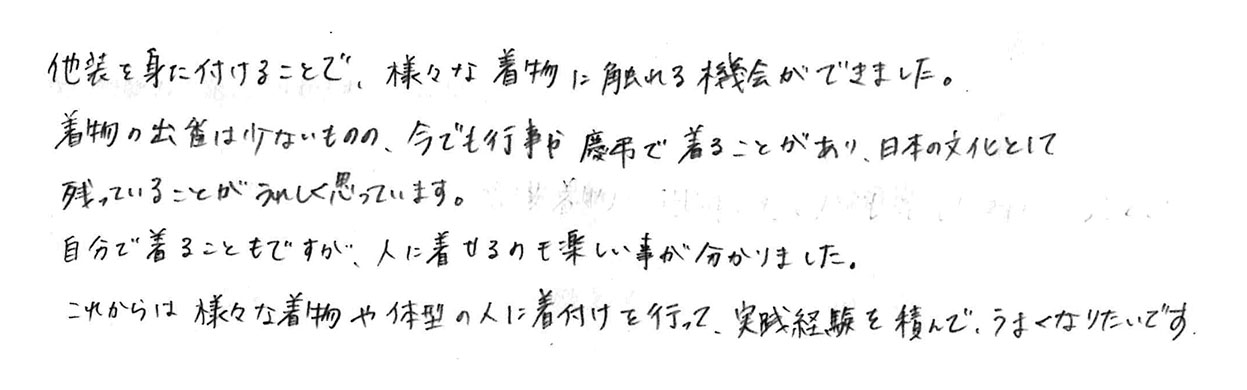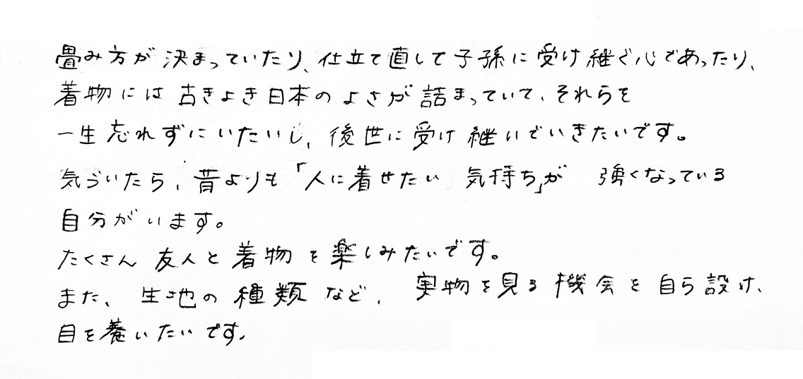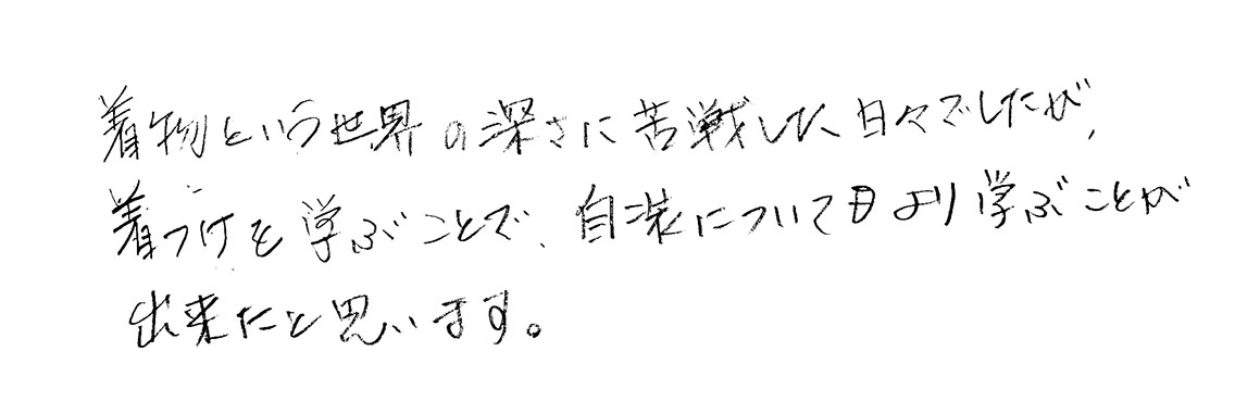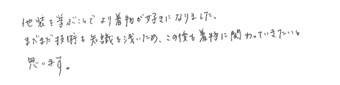 「他装を学ぶことでより着物が好きになりました。この後も着物に関わっていきたいと思います。」