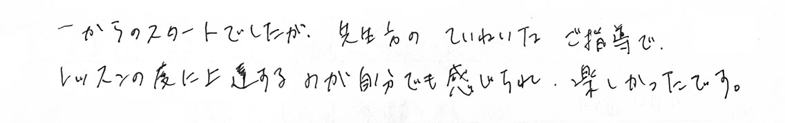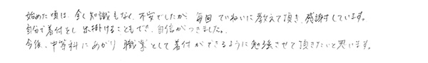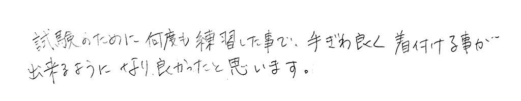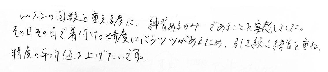 何度も繰り返し練習することで、手順がしっかりと覚えられました。ポイントをしぼって教えていただけたので、だんだん向上したと思います。