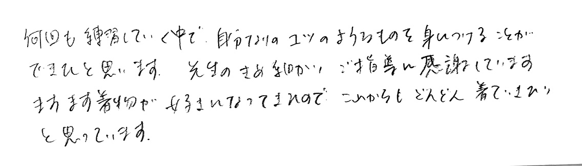 毎回とてもわかりやすく丁寧に指導していただき、楽しく着付けをマスターすることができました。また同時に着物の奥深さや楽しさも学ぶことができ、これからもどんどん着物を着る機会を増やしていけたらいいなと思っています。