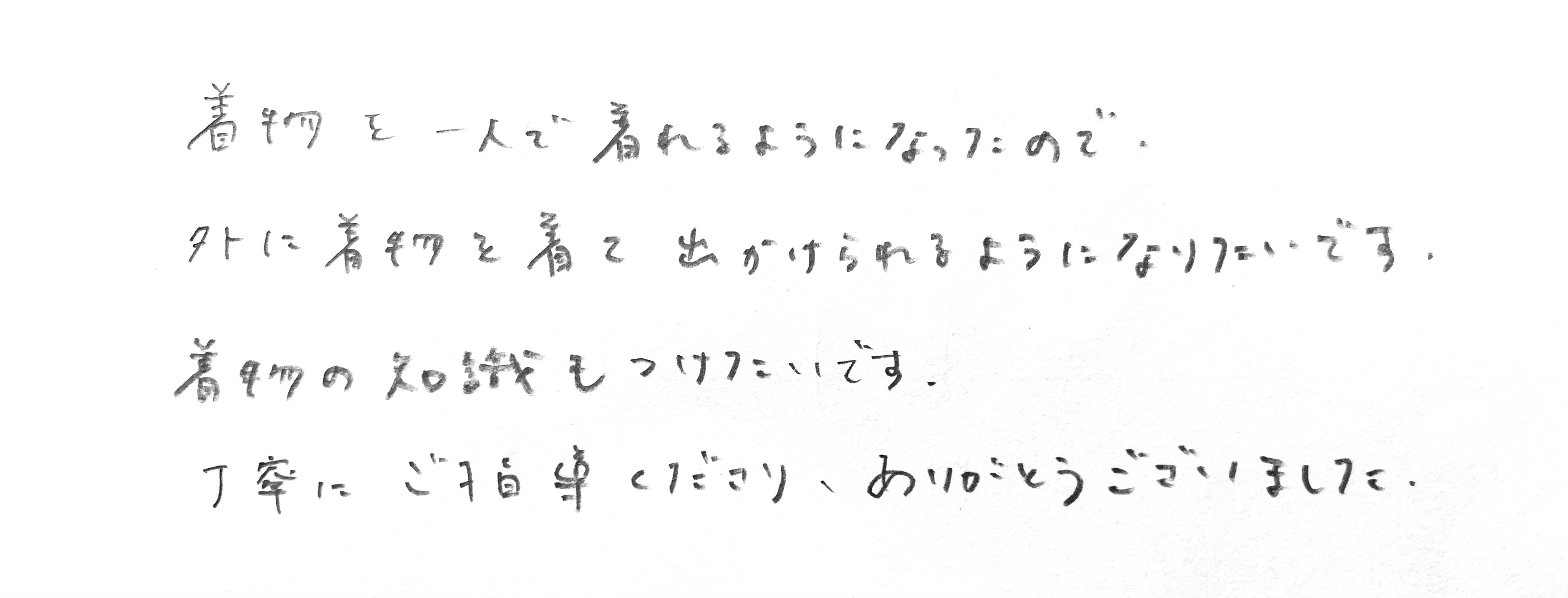 きものを全く着られなかった自分が、ここまで着られるようになり、とてもうれしく思っています。これからももっとたくさんの着物に触れ、上手に着られるようになりたいと考えています。どうもありがとうございました。