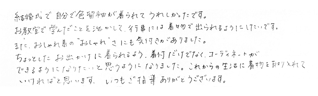 「結婚式で自分で色留袖を着られてうれしかった。学んだことを活かして行事には着物で出かけたいです。」