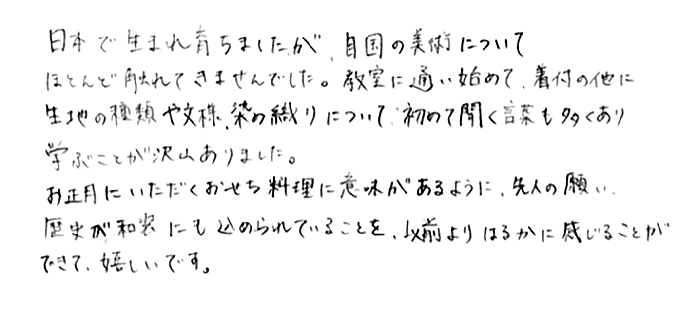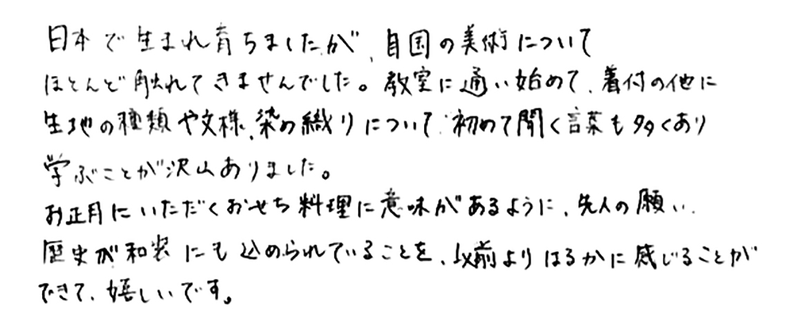 「日本で生まれ育ちましたが、自国の美術についてほとんど触れてきませんでした。教室に通い始めて着付けの他に生地の種類や文様、染め織について初めて聞く言葉も多くあり学ぶことがたくさんありました」