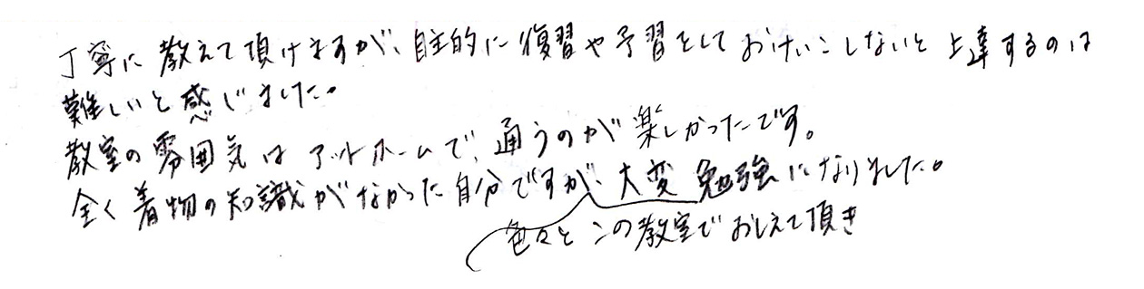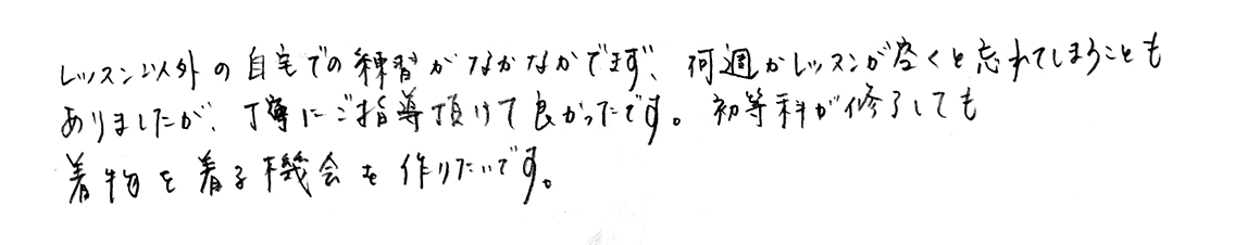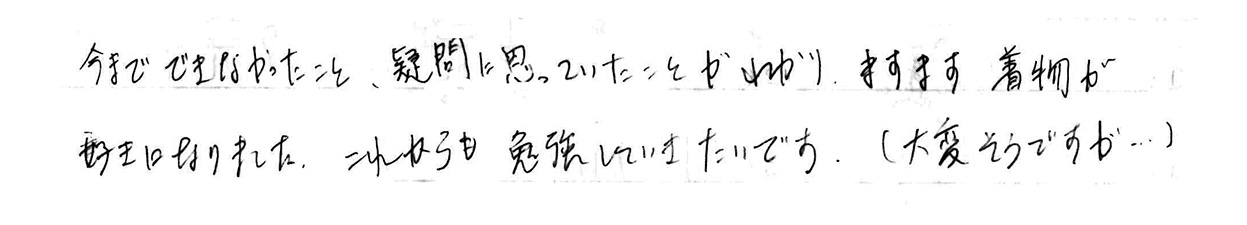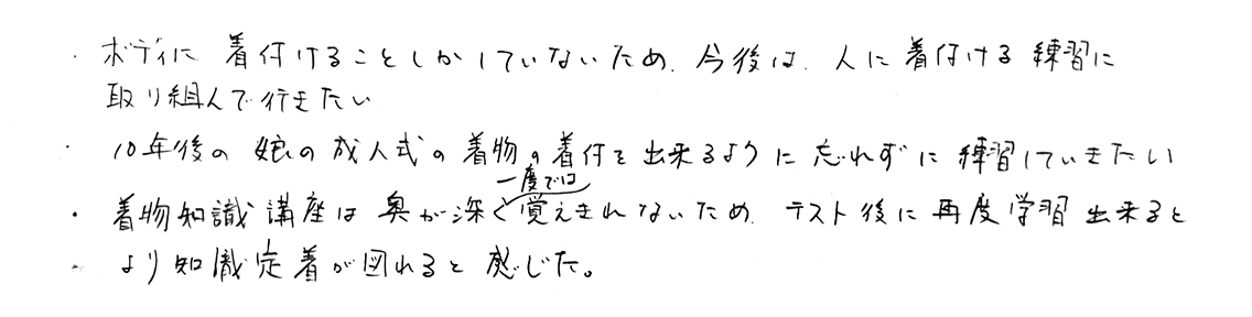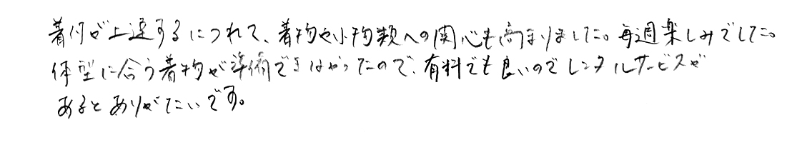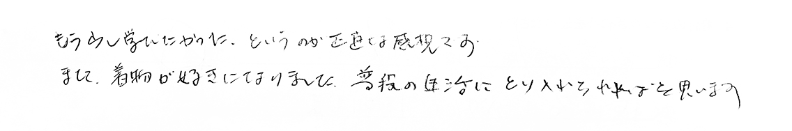 「上達するにつれて、着物や小物に関心が高まりました。毎週楽しみでした。有料でもいいので、着物の(自分の体型にあうサイズの着物)レンタルサービスがあるとありがたいです」
