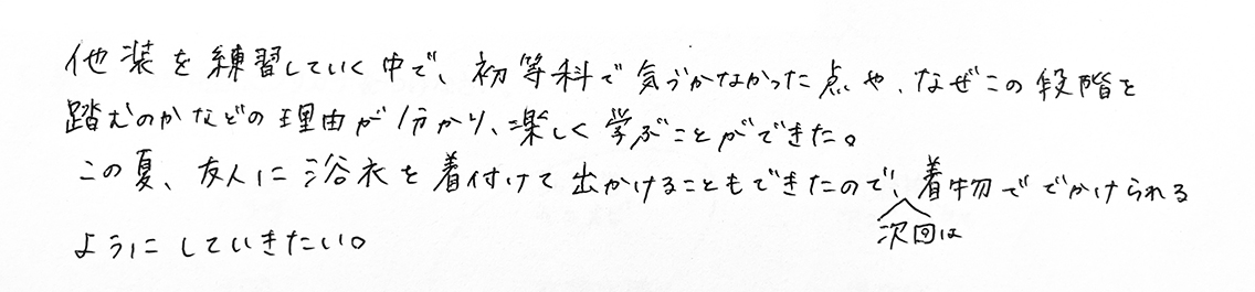 「他装を練習していく中で、初等科で気付かなかった点やなぜこの段階を踏むのかなどの理由が分かり、楽しく学べました。」