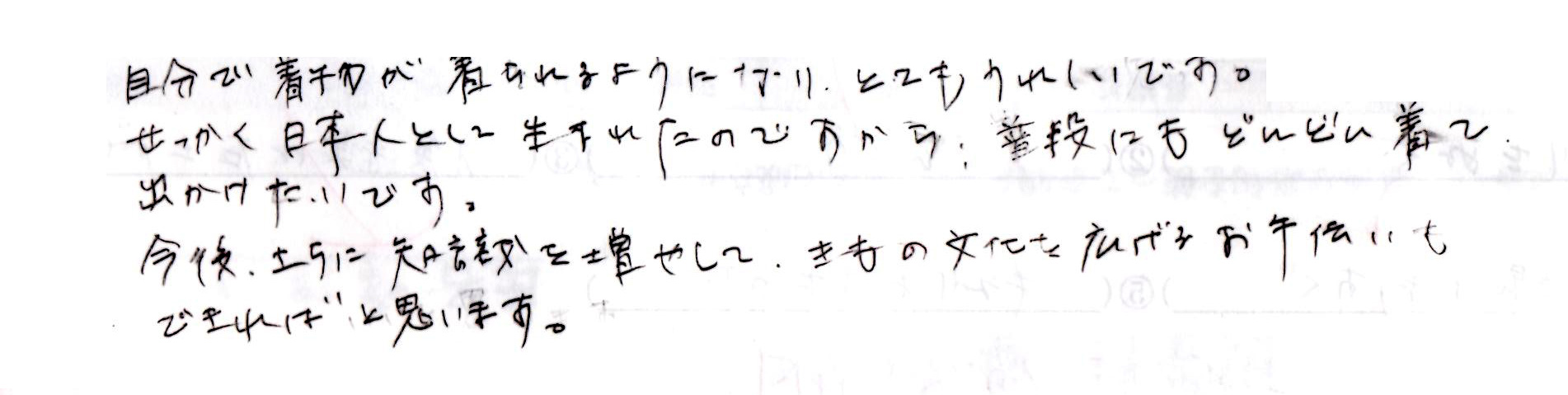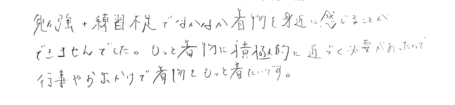「練習不足でなかなか着物を身近に感じることができませんでしたが、行事やお出かけで着物をもっと着たいです。」