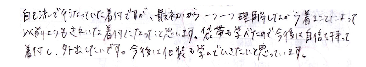 「はじめた頃は全く知識もなく不安でしたが、毎回、丁寧に教えていただき感謝しています。自分で着付けをして出かけることもでき、自信が付きました。」