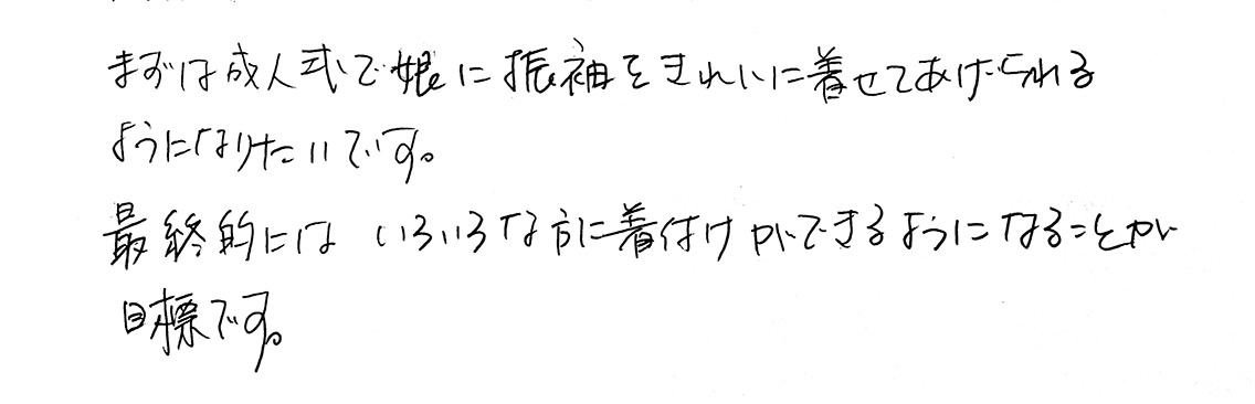 「10年後の娘の成人式の着付けができるように忘れずに練習したい。」
